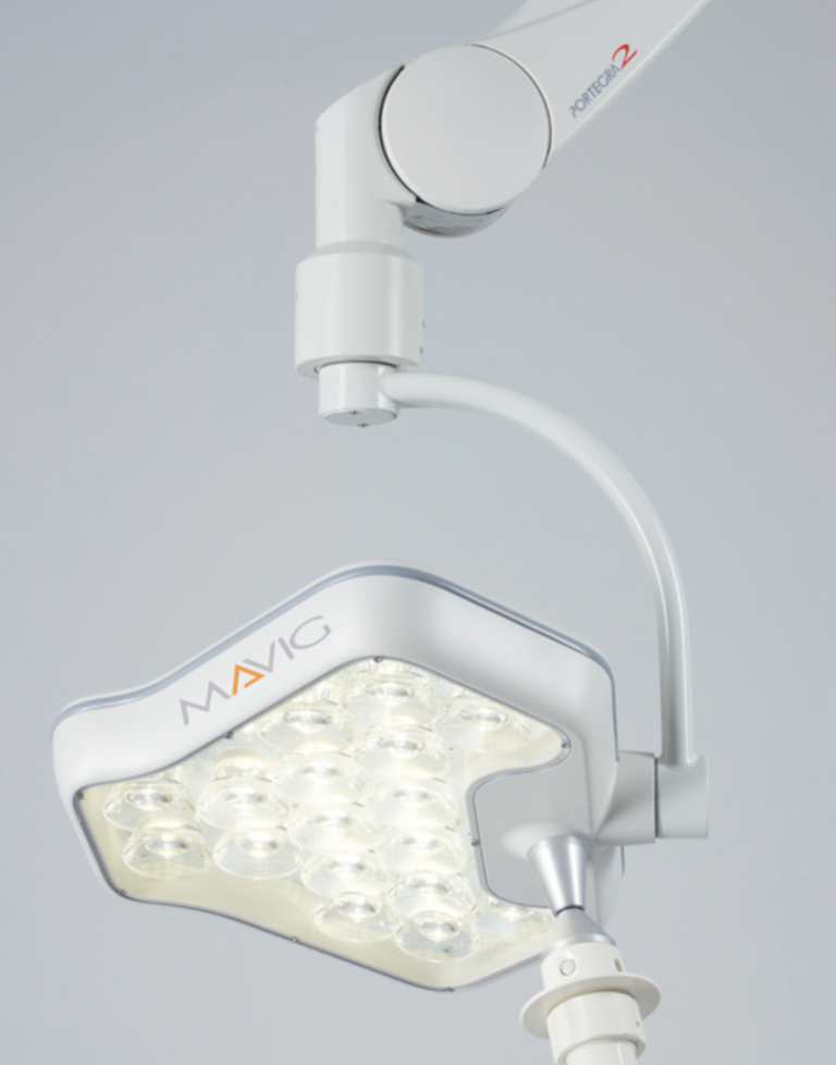 Mavigs takhängda röntgenskärm OT5001 med förinställd Portegra 2 arm är något mindre än den nyare modellen OT54001. Skärmen har en utskuren underdel för patientnära positionering.